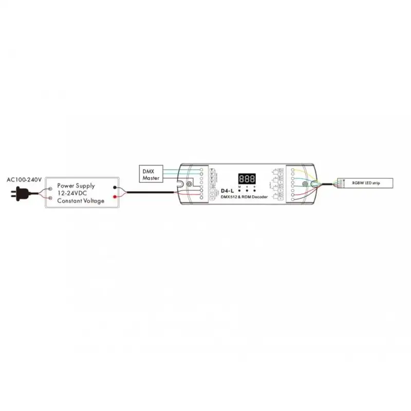Controlador DMX512 compatible con tiras LED monocolor, CCT, RGB y RGBW. Permite control profesional de iluminación con precisión y versatilidad.