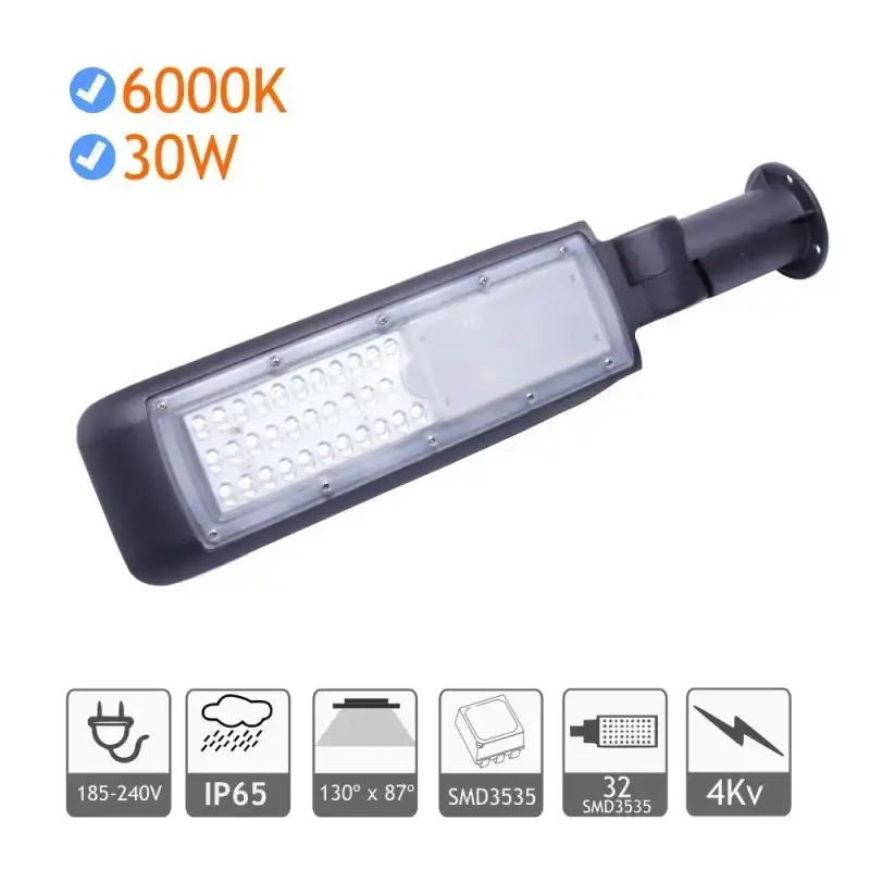 Farola LED 30W exterior en color gris, con luz blanca fría 6000K y protección contra sobretensiones de 4kV, ideal para alumbrado público eficiente y duradero.