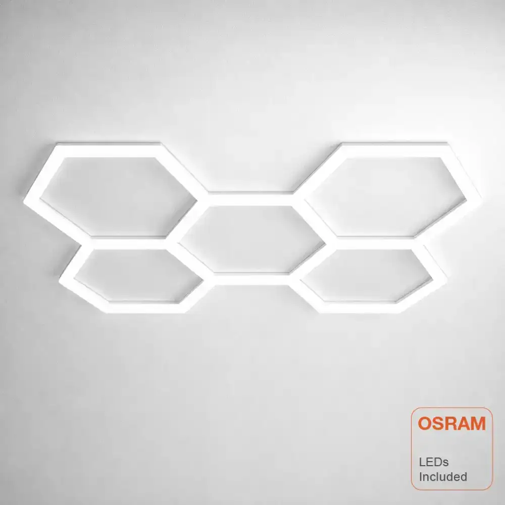 Ilumina tu garaje, taller o zona de trabajo con la lámpara LED hexagonal tipo panel de abeja ARTISTIC 120cm. Con una potencia de 960W, tecnología SMD2835 OSRAM CHIP y alta eficiencia de 150 lm/W, ofrece una luz uniforme, potente y sin sombras. Su diseño profesional con 24 regletas de 120cm y 40W garantiza máxima visibilidad y rendimiento. Incluye todo lo necesario para su montaje, facilitando una instalación rápida y sencilla. Ideal para espacios exigentes donde la iluminación marca la diferencia.
