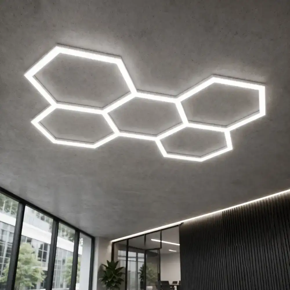 Las lámparas LED hexagonales permiten crear composiciones únicas en techos y paredes. Su estructura modular facilita la instalación de diferentes configuraciones según el espacio disponible.