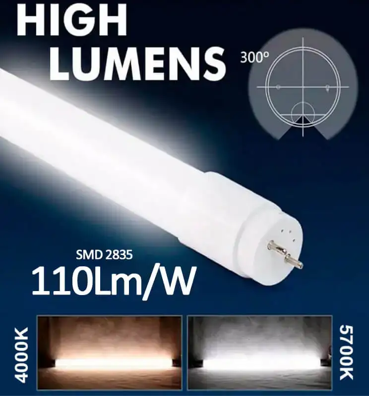 Con un ángulo de apertura de 300º, estos tubos LED iluminan prácticamente todo el entorno, evitando zonas oscuras y proporcionando una iluminación homogénea en el espacio. Esta característica los hace especialmente adecuados para instalaciones donde se requiere una buena distribución de la luz.