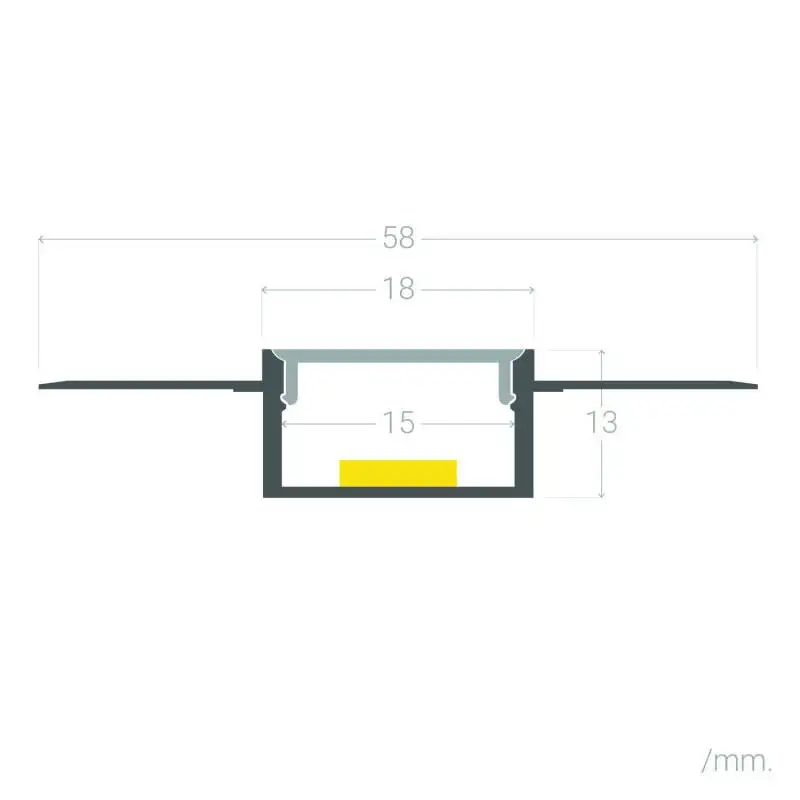 Dimensiones 2mEl perfil de aluminio para integración en escayola y pladur está diseñado para proyectos de iluminación técnica donde se busca un acabado completamente enrasado con el techo o la pared. Permite instalar tiras LED de hasta 15 mm de ancho, generando un efecto de luz lineal continua sin marcos visibles.