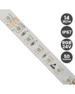 «Descubre la versatilidad y la intensidad de la iluminación con nuestra Tira LED 24V RGB de 14W por metro. Con 60 LED por metro y una protección IP67, este rollo de 50 metros te permite crear efectos de iluminación personalizados y duraderos en interiores y exteriores. Transforma tu espacio con colores vibrantes y control total. ¡Explora ahora!»