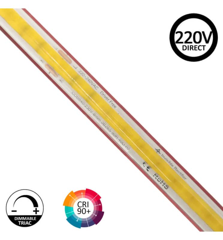 La tira LED COB 220V de alta densidad redefine la iluminación profesional y doméstica con una línea de luz impecablemente continua. Utilizando tecnología COB (Chip On Board) y el método Flip Chip, cada metro integra 840 LED sin el tradicional efecto «punto», logrando un efecto visual uniforme, elegante y sin interrupciones. Es un sistema plug and play preparado para conectar directamente a la red eléctrica (220V-240V), evitando transformadores voluminosos y facilitando la instalación en todo tipo de proyectos, desde viviendas y comercios hasta espacios exteriores como fachadas, terrazas y jardines protegidos.