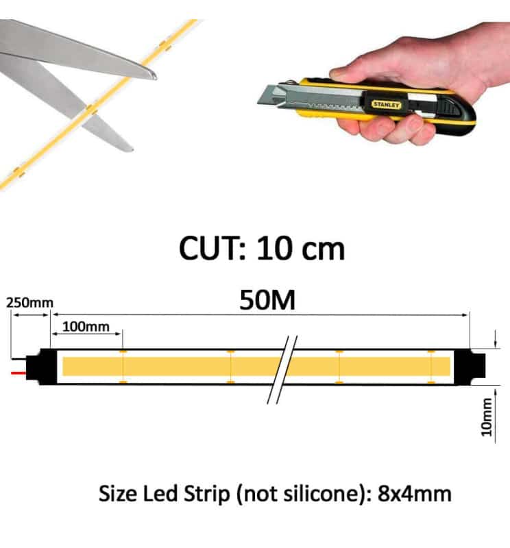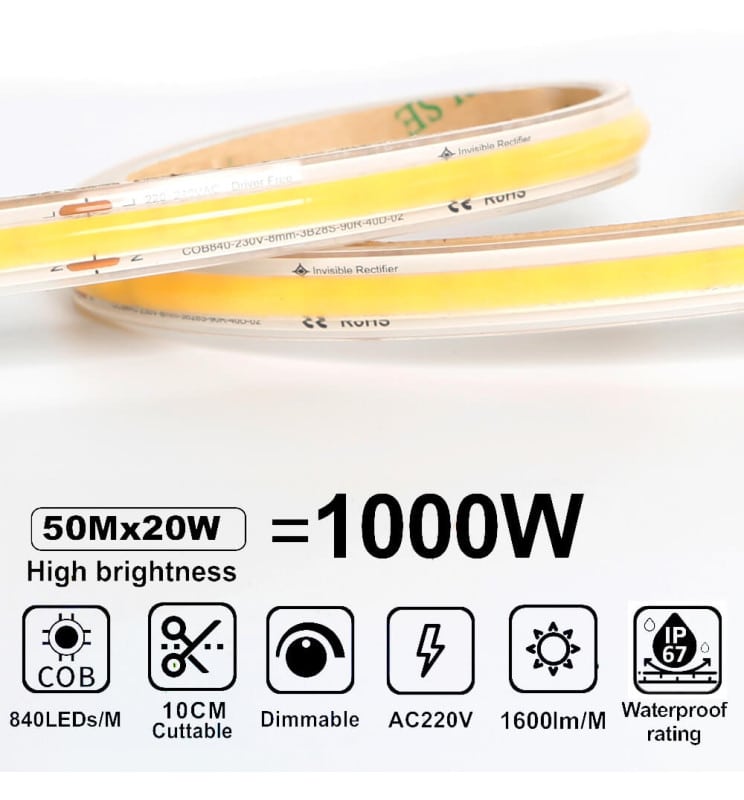 En definitiva, si buscas la mejor combinación entre potencia, estética, durabilidad y facilidad de instalación, esta tira LED COB 220V IP67 de 50 metros es la elección perfecta. Ideal para instalaciones largas sin cortes ni transformadores, garantiza una línea de luz elegante, eficiente y resistente a la intemperie. Cubre las necesidades tanto de profesionales de la iluminación como de particulares que quieren dar un salto de calidad en su hogar o negocio. Haz tu pedido y transforma tus espacios en lugares únicos y funcionales con tecnología LED de última generación.