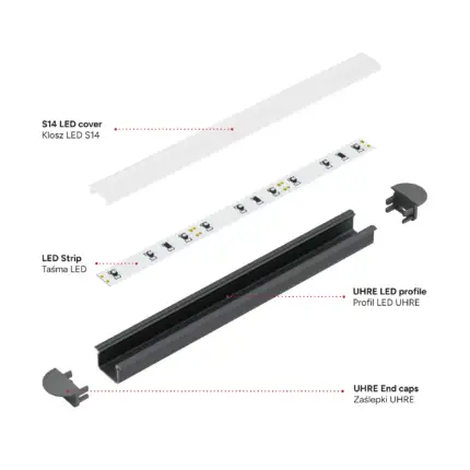 Perfíl Aluminio KIMERA-"UHRE" Anodizado Negro con Difusor Opal , Tapones y Clips Sujección 2,02M